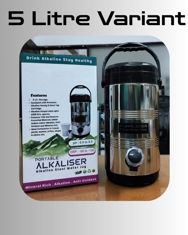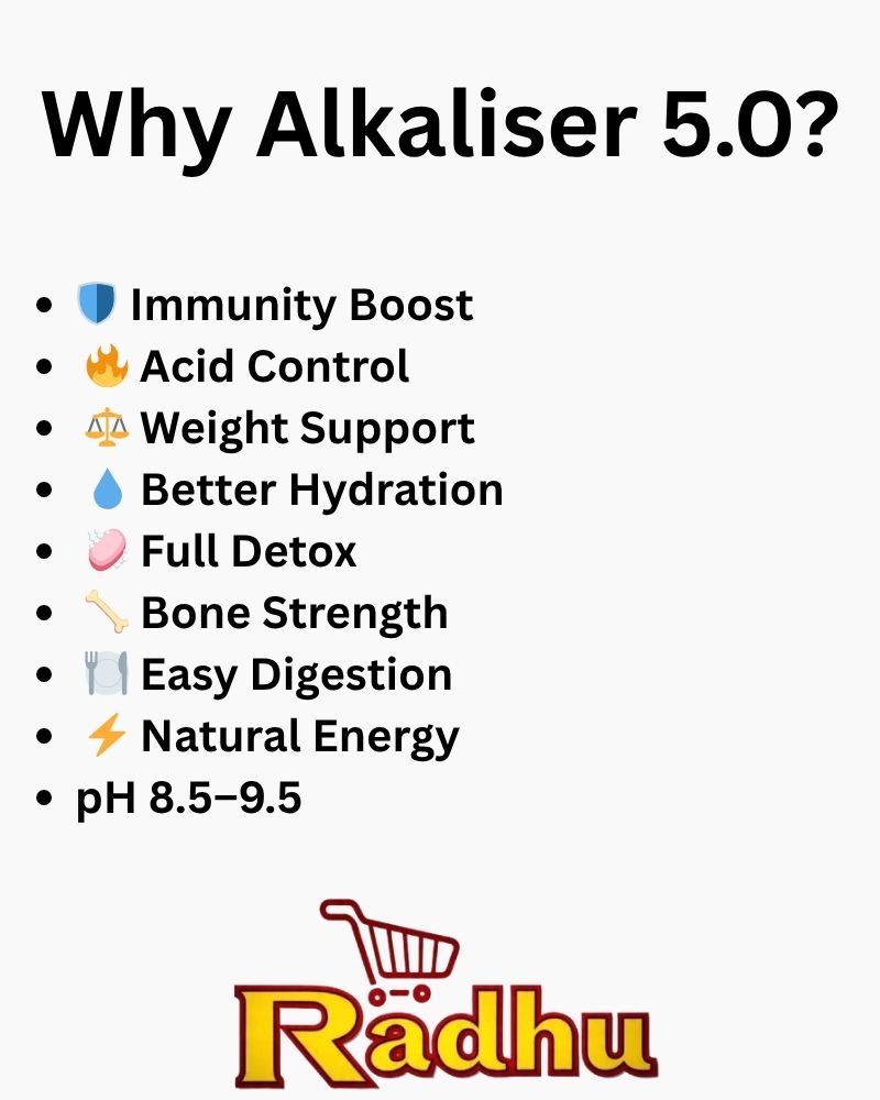 Transform your regular drinking water into pure, alkaline-rich health fuel with the Radhu Alkaliser 5.0 – a premium 5-liter stainless steel jug designed to neutralize acidity, boost energy, and support your overall well-being.