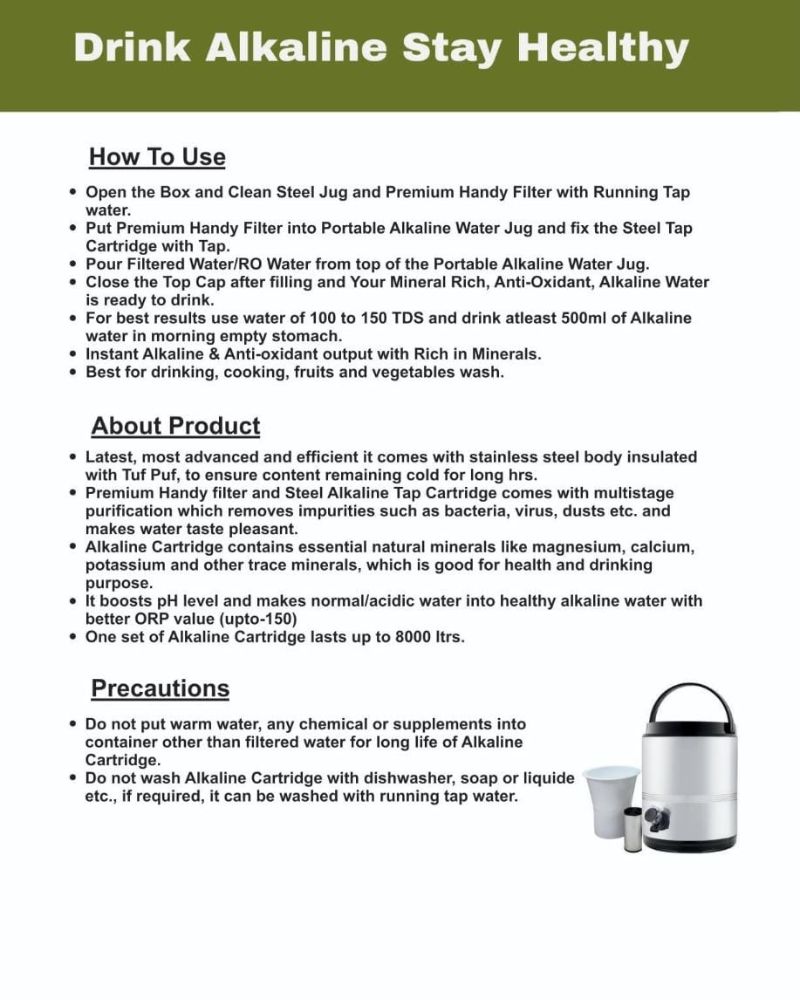 Made with high-grade steel and an advanced steel cartridge system, this jug is your daily partner for better hydration, digestion, and immunity – all naturally.